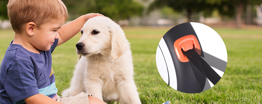 • Az egygombos zárszerkezet elegáns és kényelmes. Egy egyszerű megnyomással a póráz biztonságosan rögzül, megakadályozva, hogy kedvence előreszaladjon vagy hátra húzódjon. A gomb sima és érzékeny, így nem akad el vagy ragad, a lefelé mutató kioldó kialakítás pedig egyszerűvé és gyorssá teszi a kezelést.